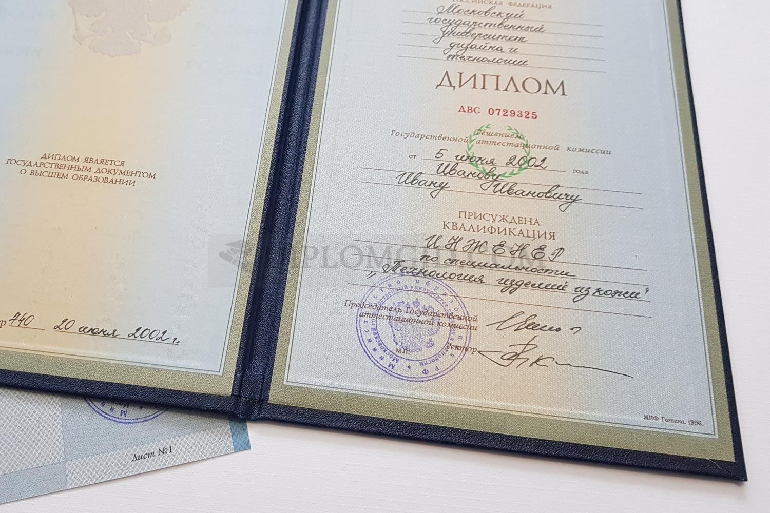На нашем сайте Вы можете купить диплом с окончанием в 1997-2003 годах без обучения, выданный любым ВУЗом Москвы и других городов России. В комплект входит бланк, обложка и приложение, оформленные по всем стандартам.