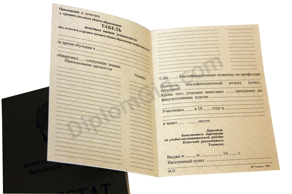 На нашем сайте Вы можете аттестат о среднем общем образовании (11 классов) без обучения, выданный любым школой Москвы и других городов России в период с 1994 по 2006 год. В комплект входит бланк, обложка и приложение, оформленные по всем стандартам.